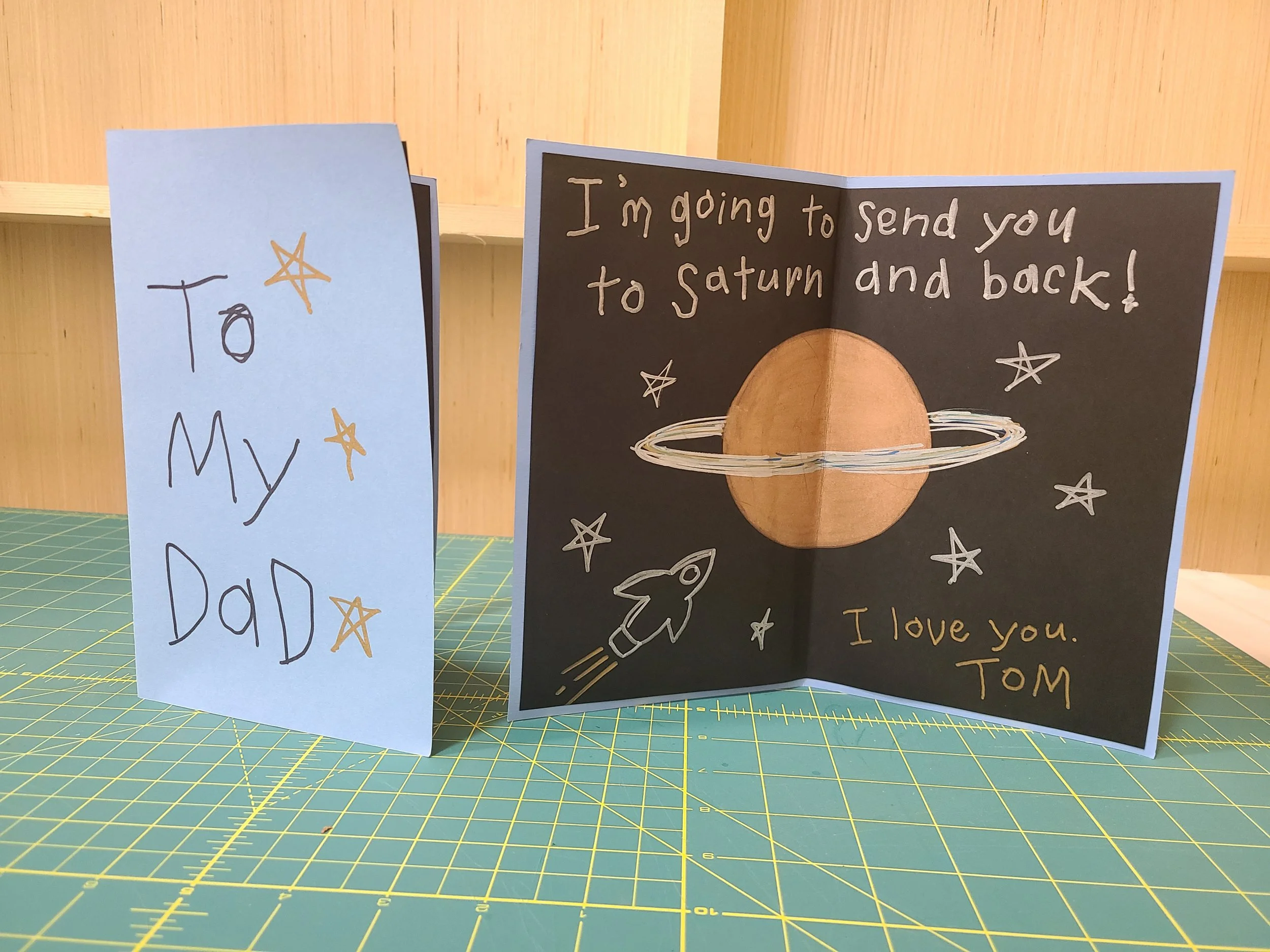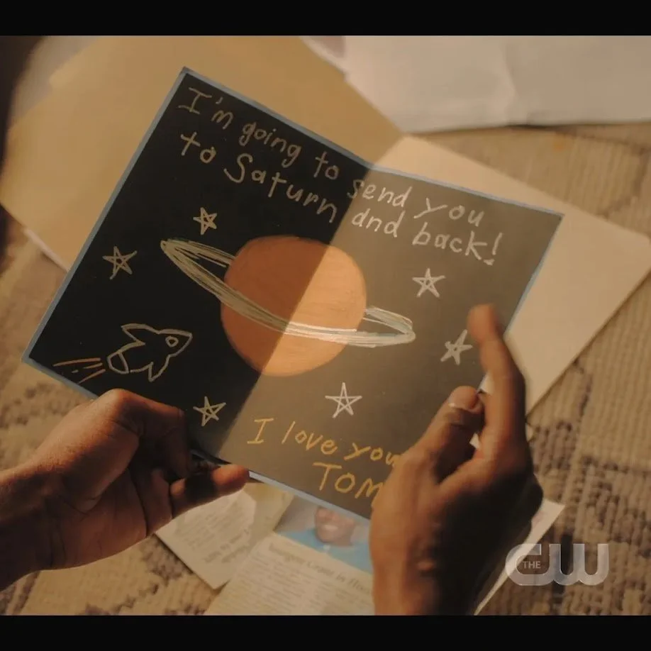In this scene, one of the items Tom finds is this card he made for his dad when he was 8 years old.
